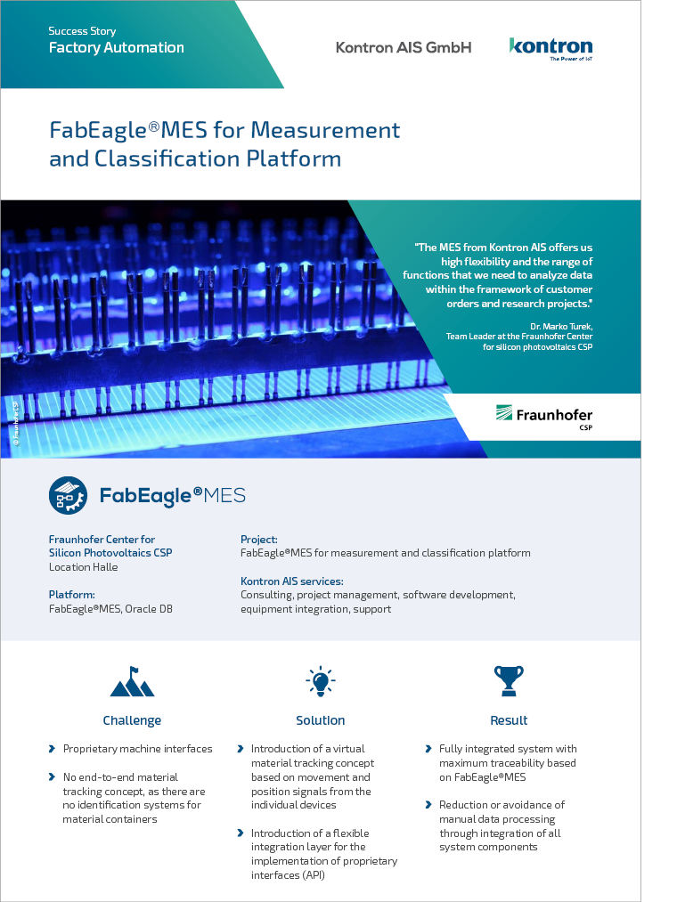The basic configuration for the research project was created quickly and efficiently using the current range of functions of the FabEagle®MES. The modular configuration of the Fraunhofer CSP platform with its processing and measurement systems makes it possible to extend the control and data transfer of the individual systems at any time, as well as integrate additional stations into FabEagle®MES.
