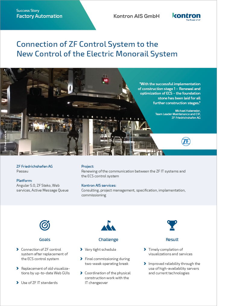The existing electric monorail system (EMS) of ZF Friedrichshafen AG at the Passau plant 2 was modernized in several stages. In addition to the structural conversion work, this also entailed changes in the IT landscape and data communication. The communication between the ZF IT systems and the EMS control system had to be renewed as the existing control system was replaced. In the course of this conversion, the historically grown IT applications were also updated to the ZF standard IT architecture.