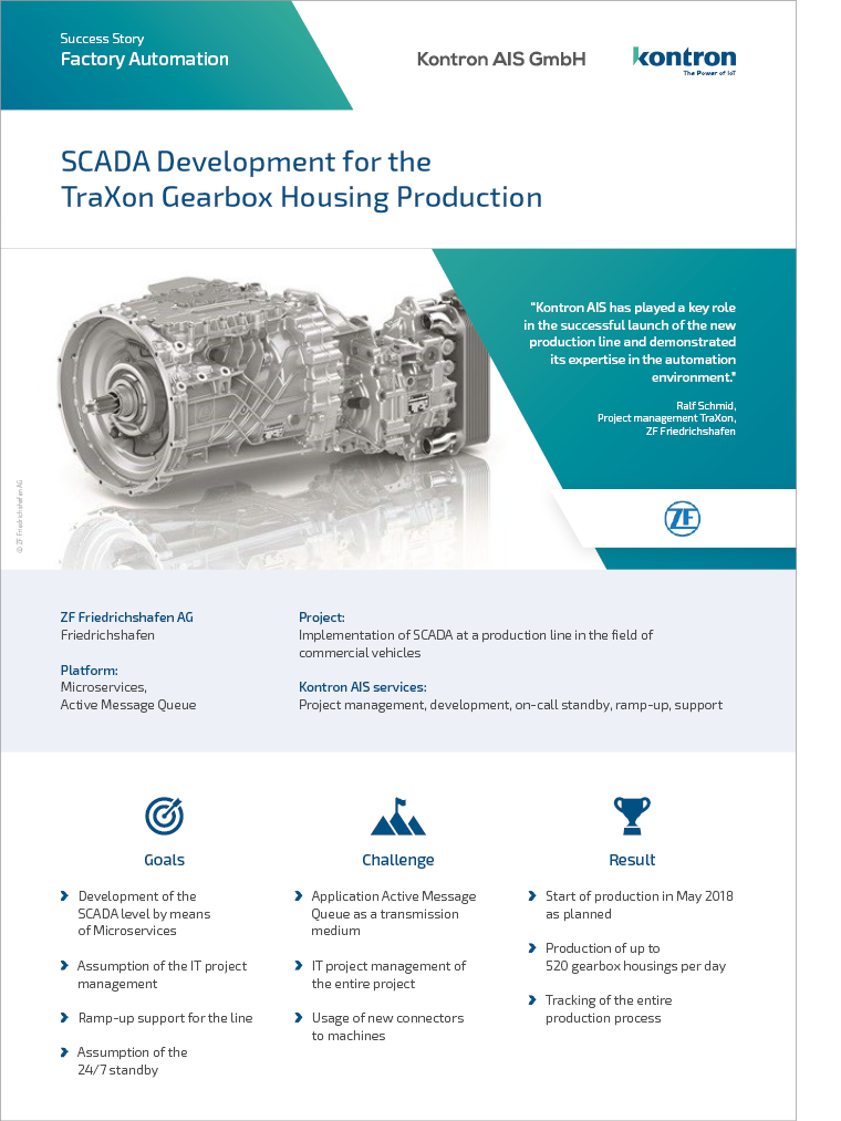 In the second quarter of 2018, the ZF Friedrichshafen AG has started operations of a new production line for the gearbox housing production in the field of commercial vehicles. The Kontron AIS GmbH took over the SCADA development and adaptation to the manufacturing environment with various interfaces to machine suppliers, the MES and SAP of ZF. Furthermore, Kontron AIS assumed the entire IT project management.