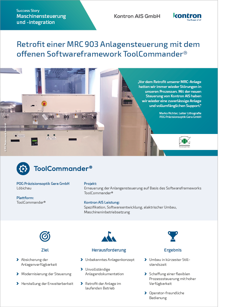 „Vor dem Retrofit unserer MRC-Anlage hatten wir immer wieder Störungen in unseren Prozessen. Mit der neuen Steuerung von Kontron AIS haben wir wieder eine zuverlässige Anlage und vollumfänglichen Support.” Marko Richter, Leiter Lithografie POG Präzisionsoptik Gera GmbH