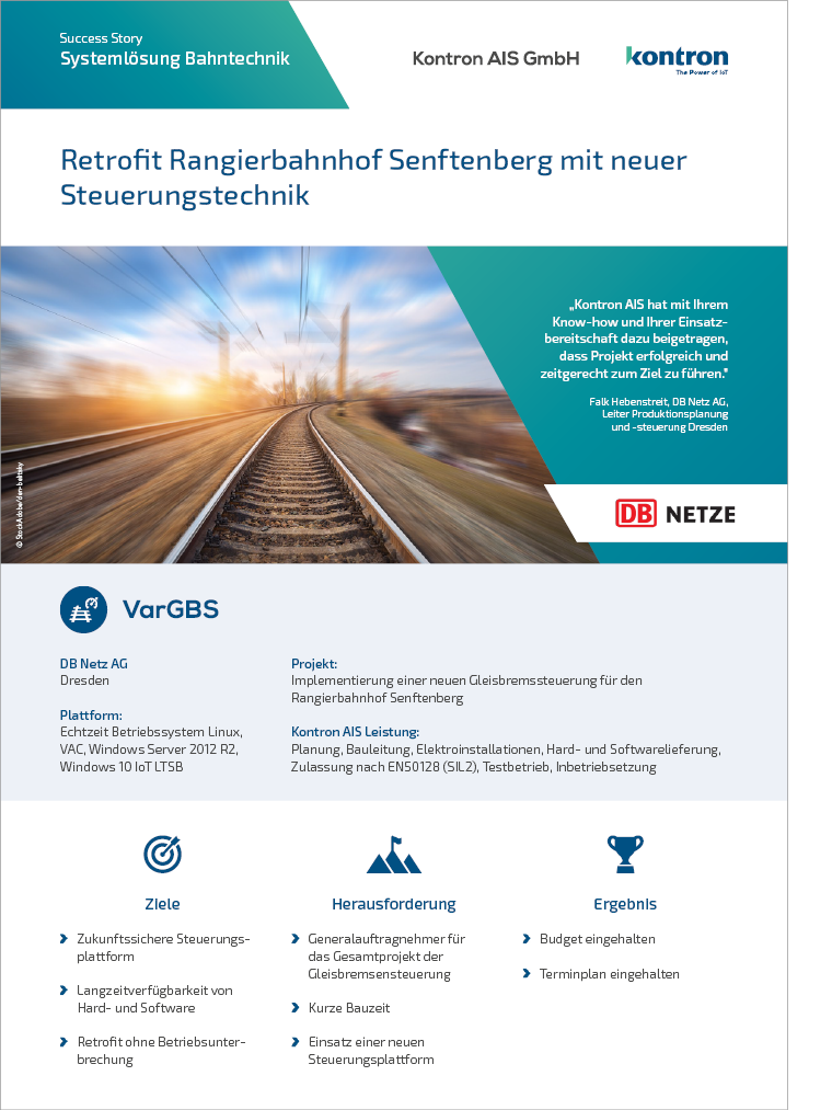 Durch die Kontron AIS GmbH konnte die DB Netz AG unter Projektleitung der DB Engineering & Consulting GmbH erfolgreich das steuerungstechnische Retrofit für den Rangierbahnhof Senftenberg mit der neuen Gleisbremsensteuerung VarGBS abschließen. Innerhalb von nur zweieinhalb Monaten Bauzeit unter „rollendem Rad“ wurde die alte Steuerungstechnik für zwei Tal- und 19 Richtungsgleisbremsen durch die neue Generation des Steuerungssystems VarGBS ersetzt.