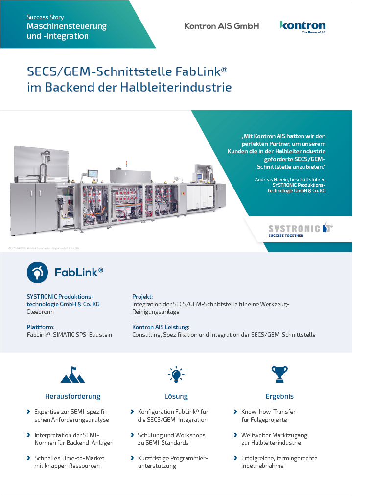 Der Einsatz einer Reinigungsanlage der SYSTRONIC Produktionstechnologie GmbH & Co. KG in einer Halbleiterfabrik erforderte eine SECS/GEM-Schnittstelle zur Anbindung an das Fertigungssteuerungssystem (MES). Mit FabLink® lieferte Kontron AIS GmbH ein etabliertes Produkt zur Anlagenintegration mit mehr als 14.000 Referenzen. Sie stand dem Kunden mit erfahrenen Expert*innen zur Seite, integrierte die SECS/GEM-Schnittstellenkomponente und befähigte den Kunden Folgeprojekte mit SECS/GEM-Anbindungen erfolgreich selbst umzusetzen.