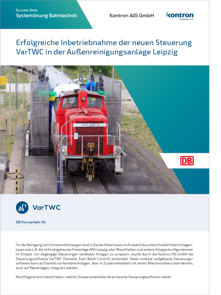 Für die Reinigung von Schienenfahrzeugen sind in Deutschland sowie im Ausland die unterschiedlichsten Anlagentypen wie z. B. die nicht eingehauste Freianlage ARA Leipzig oder Waschhallen und andere Anlagenkonfigurationen im Einsatz. Um abgängige Steuerungen veralteter Anlagen zu erneuern, wurde durch die Kontron AIS GmbH die Steuerungssoftware VarTWC (Variable Train Wash Control) entwickelt. Diese modular aufgebaute Steuerungssoftware kann auf bereits vorhandene Anlagen, aber in Zusammenarbeit mit einem Maschinenbauunternehmen, auch auf Neuanlagen, integriert werden.